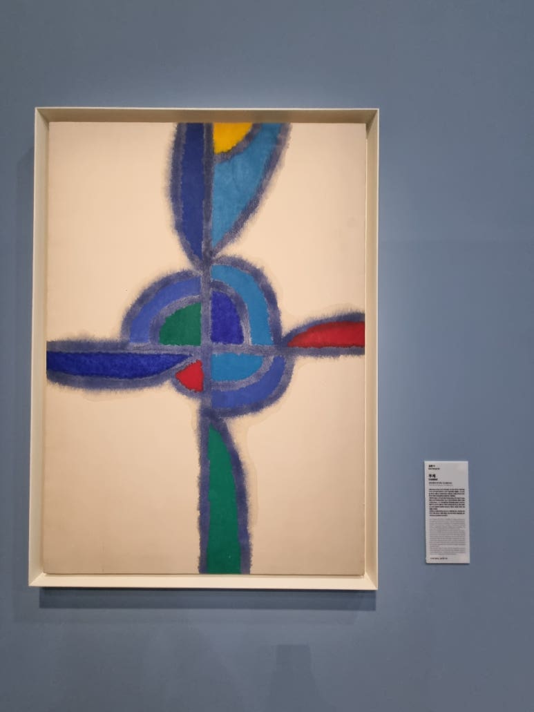 1930년대 일제 강점기 시절에 도쿄에서 유학 도중 서양 미술에 접한 김환기는 입체주의, 미래주의 ,추상미술 등 새로운 미술 경향을 실험합니다. 점 , 선 , 면의 기본 조형 요소를 골고로 사용하면서 화면을 점으로 가득 채우는 완전한 추상의 전면 점화로 작품을 완성합니다.