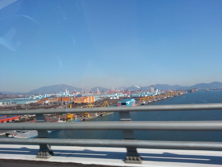 현수교 건설 기술의 핵심인 주탑 간 거리를 이순신 탄생연도로 설계한 것은 광양만이 임진왜란 7년 전쟁을 승리로 장식한 최후의 전투 공간이라는 의미를 갖기때문이라고 합니다. 하늘과 바다 사이의 평행선, 철로 만든 하프로도 불릴 만큼 아름다운 이순신대교를 건너다보면 광양제철소와 광양만이 한눈에 들어와 웅장했습니다.
